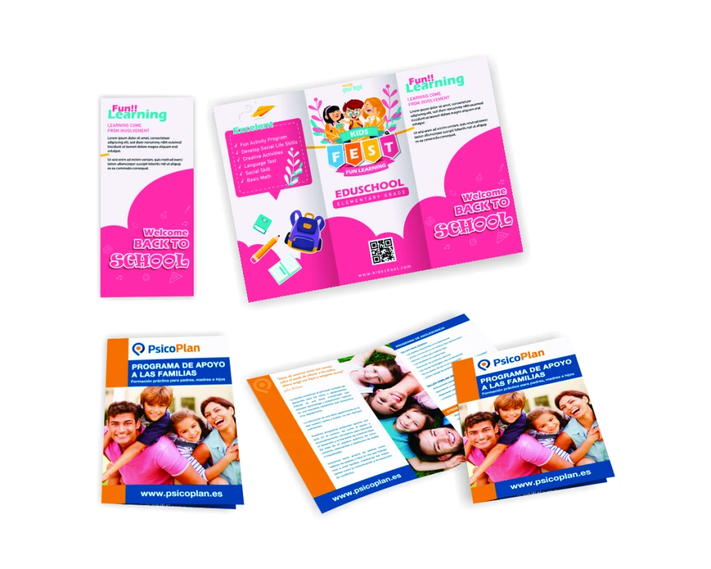 Los folletos Dípticos/Trípticos ofrecen una estética para publicitar e informar, ideal para destacar múltiples promociones ilustradas, ofrecen un espacio suficiente para incluir información clave, imágenes atractivas y diseños coloridos que reflejen la identidad de la marca. Son ideales para distribuir en eventos, puntos de venta, permitiendo comunicar promociones, productos o servicios de manera efectiva y visualmente impactante.